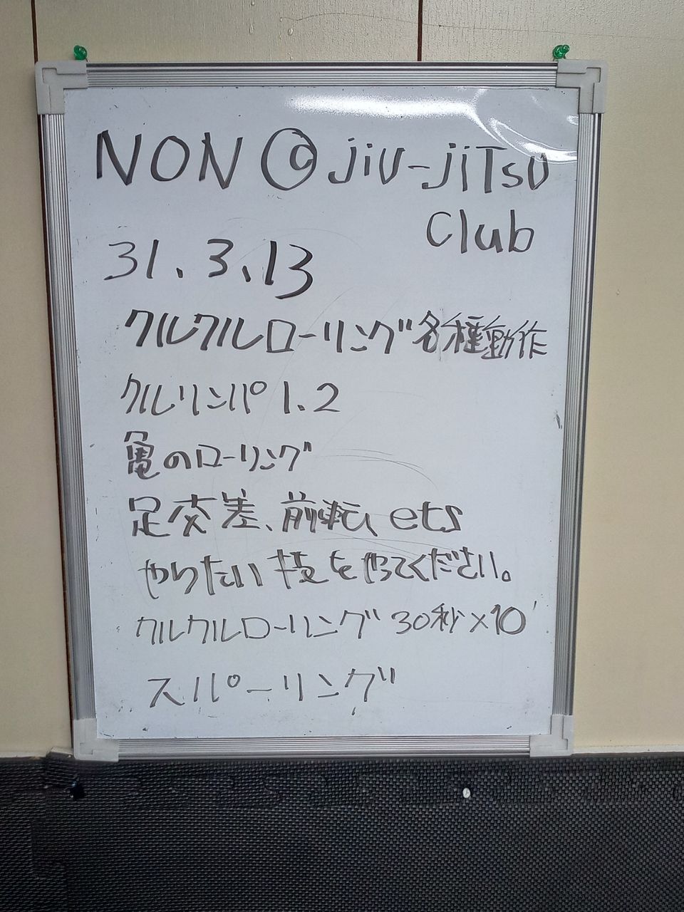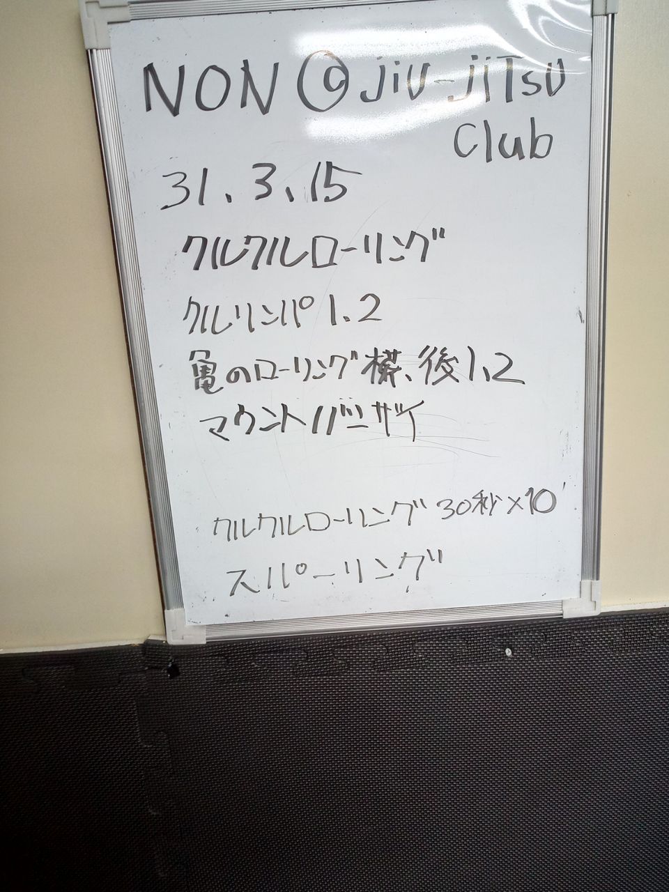 2019年03月17日 non@jjc光市練習3月17日第19回 基本動作首抜き後転、前転トコトコ1.2.3脚回し 壁回り1.2.34種類のサイドポジション抑え込まれる前と後の考え!肩、脇のサイドポジションとエスケープクルクルローリングの説明クルリンパ1.2亀Guardからのローリング軽い抑え込みをローリングクルクルローリング1分×10